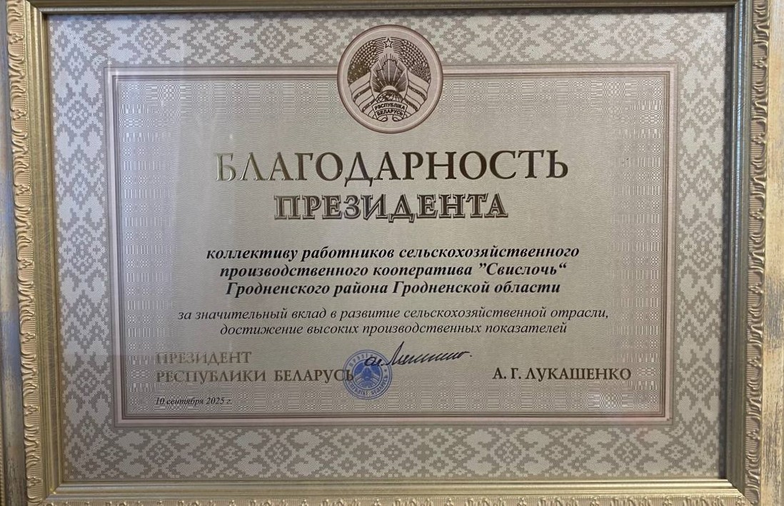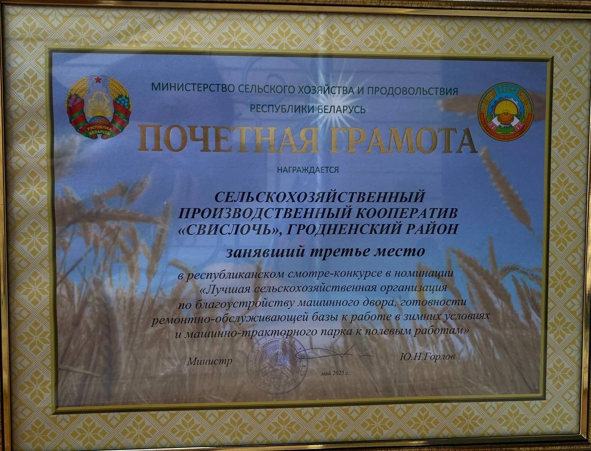 | 2025 год | Благодарность Президента Республики Беларусь за значительный вклад в развитие сельскохозяйственной отрасли, достижение высоких производственных показателейДиплом Комитета по сельскому хозяйству и продовольствию Гродненского областного исполнительного комитета за 1-ое место в областных соревнованиях за достижение высоких показателей на уборке урожая зерновых и зернобобовых растений в 2025 году.Почетная грамота Министерства сельского хозяйства и продовольствия за 3-ое место в республиканском смотре-конкурсе в номинации "Лучшая сельскохозяйственная организация по благоустройству машинного двора, готовности ремонтно-обслуживающей базы к работе в зимних условиях и машинно-тракторного парка к полевым работам" в 2025 году