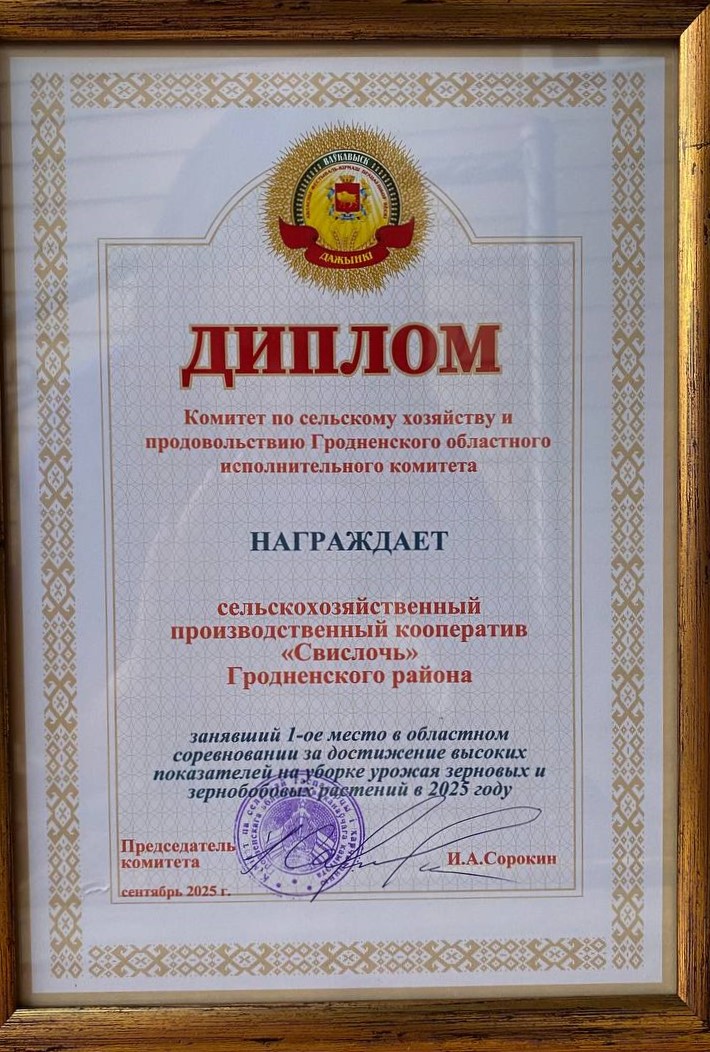 | 2023 год | Диплом Комитета по сельскому хозяйству и продовольствию Гродненского областного исполнительного комитета за 1-ое место в областном соревновании за достижение высоких показателей на уборке урожая зерновых и зернобобовых растений